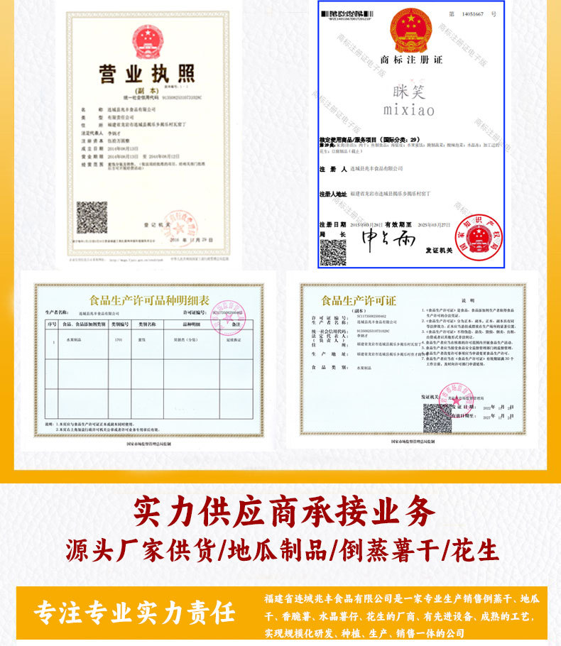 本网页所展示的有关【红薯干地瓜干批发不加糖厂家条片整箱真空网红紫薯干倒蒸分销代发_土特产_连城县兆丰食品有限公司】的信息/图片/参数等由新疆旅游商城的会员【连城县兆丰食品有限公司】提供,由新疆旅游商城会员【连城县兆丰食品有限公司】自行对信息/图片/参数等的真实性、准确性和合法性负责,本平台(本网站)仅提供展示服务,请谨慎交易,因交易而产生的法律关系及法律纠纷由您自行协商解决,本平台(本网站)对此不承担任何责任。您在本网页可以浏览【红薯干地瓜干批发不加糖厂家条片整箱真空网红紫薯干倒蒸分销代发_土特产_连城县兆丰食品有限公司】有关的信息/图片/价格等及提供【红薯干地瓜干批发不加糖厂家条片整箱真空网红紫薯干倒蒸分销代发_土特产_连城县兆丰食品有限公司】的商家公司简介、联系方式等信息。