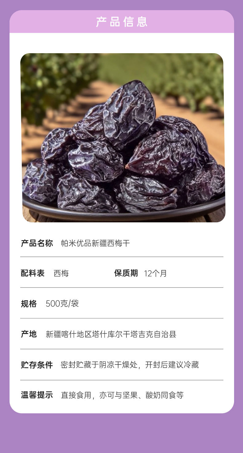 本网页所展示的有关【新疆西梅干无加蔗糖无添加低脂孕妇酸甜零食西梅特产非特级乌梅子_土特产_塔什库尔干塔吉克自治县疆域优品生物科技有限公司】的信息/图片/参数等由新疆旅游商城的会员【塔什库尔干塔吉克自治县疆域优品生物科技有限公司】提供,由新疆旅游商城会员【塔什库尔干塔吉克自治县疆域优品生物科技有限公司】自行对信息/图片/参数等的真实性、准确性和合法性负责,本平台(本网站)仅提供展示服务,请谨慎交易,因交易而产生的法律关系及法律纠纷由您自行协商解决,本平台(本网站)对此不承担任何责任。您在本网页可以浏览【新疆西梅干无加蔗糖无添加低脂孕妇酸甜零食西梅特产非特级乌梅子_土特产_塔什库尔干塔吉克自治县疆域优品生物科技有限公司】有关的信息/图片/价格等及提供【新疆西梅干无加蔗糖无添加低脂孕妇酸甜零食西梅特产非特级乌梅子_土特产_塔什库尔干塔吉克自治县疆域优品生物科技有限公司】的商家公司简介、联系方式等信息。